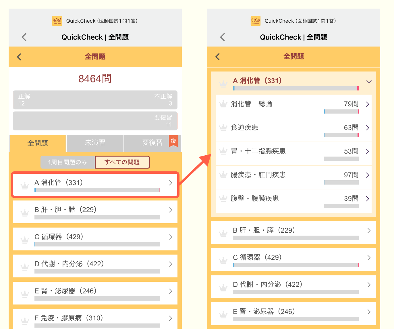 次の画面では,A章(消化管)~Y章(公衆衛生)の中から,解きたいテーマを選んでください.