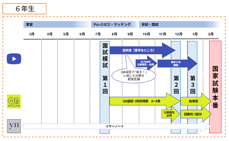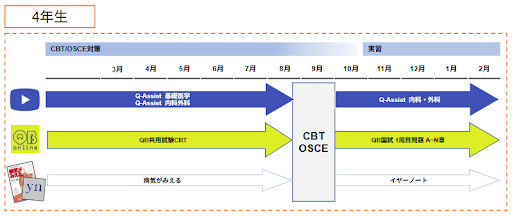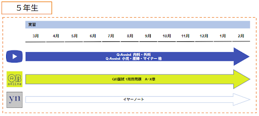 5年生の間は実習でまわる科にあわせて計画的に「Q-Assist」の「内科・外科」や「小児」「産婦」「マイナー」を視聴しつつ,「QB国試」を進めます.