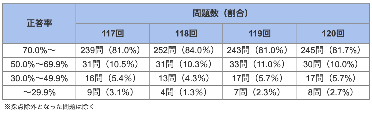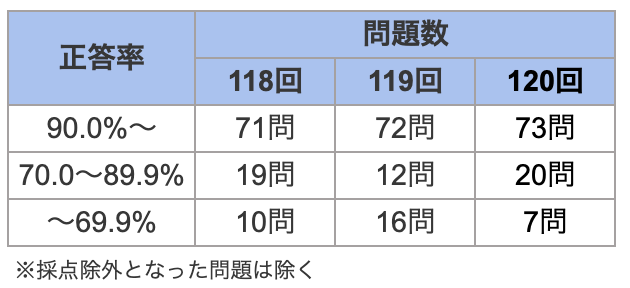 120回の必修問題は正答率70%未満の難問が減り,70〜90%未満の標準的な問題が増加したことから,多くの受験生が正解する問題を確実に解く力が求められていると考えられます.