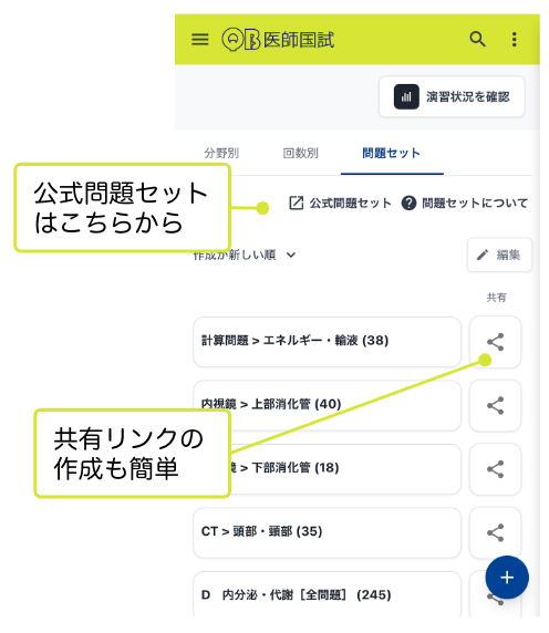 QBでは,自分でオリジナルの「問題セット」を作成・編集できます。また,メディックメディアが作成している「公式問題セット」を自分のQBに取り込むこともできます.