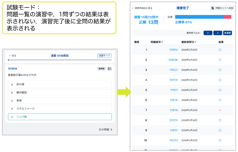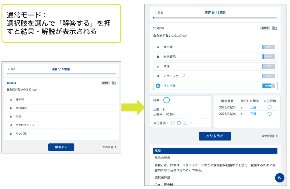 今回,新機能として「演習モード」を選択できるようになりました.通常/試験/解説閲覧モードの3つから目的にあった演習モードを選択しましょう.普段は「通常モード」で1問ずつ解説を確認して復習しながら,試験前には「試験モード」で本番形式に慣れておく,という使い方もおすすめです.