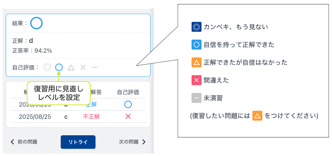 自分の理解度や自信に合わせて◎,◯,△,×を設定しておくことで,2周目の演習時に[◎]を表示させないようにしたり,[△]と[×]に絞って演習をしたりと,復習の幅が広がります.