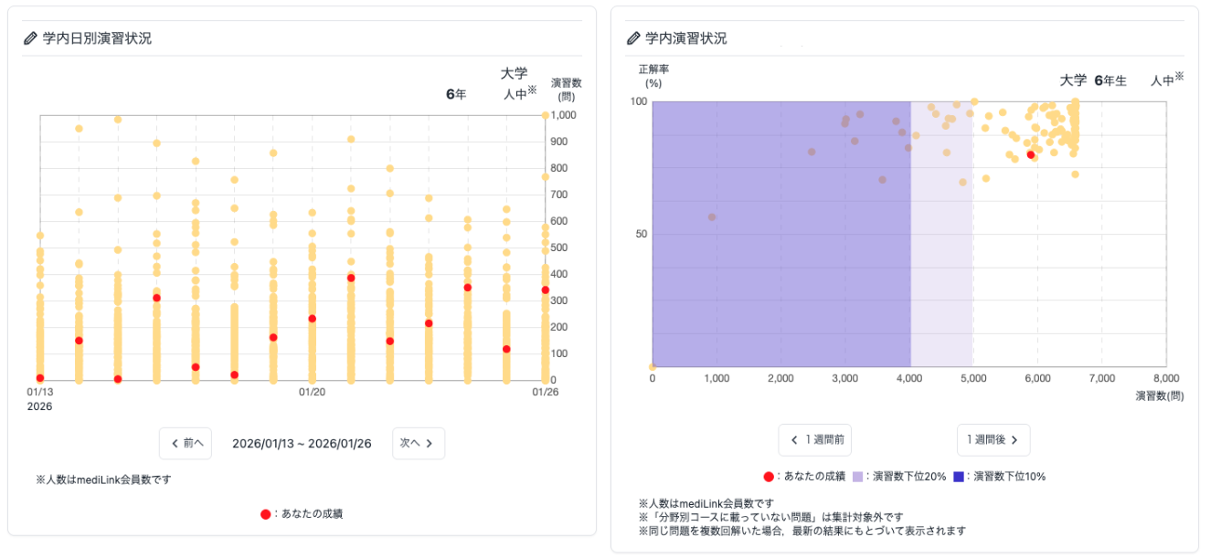 「演習状況」のグラフでは,自分と学内の同級生の演習数を比較できます.