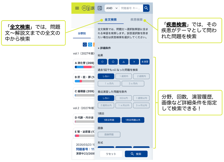 より条件を指定して検索をかけたいときには「詳細条件」を設定することで,章,回数,必修,画像など,条件をかけ合わせて問題を絞り込むことができます.