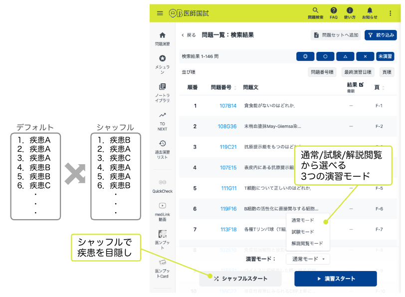 しかし!演習開始時に「シャッフルする」を選ぶと,問題の並びがシャッフルされるので,疾患を“目隠し”した状態で問題を解くことができるのです.