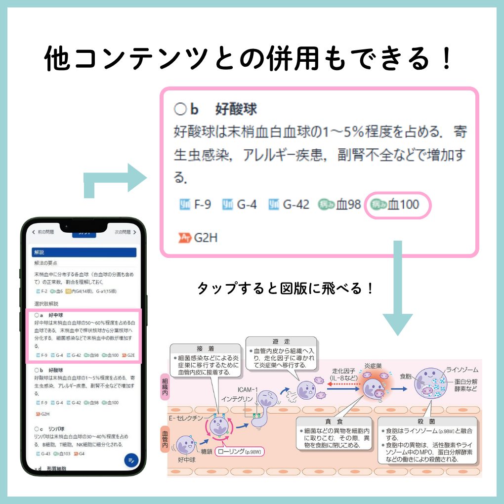 また,解説がより理解しやすくなるよう,『病気がみえる』『イヤーノート』のイラストや図表を,解説内にも多数引用しています.併用することにより,繰り返し効果で記憶に定着しやすくなります!