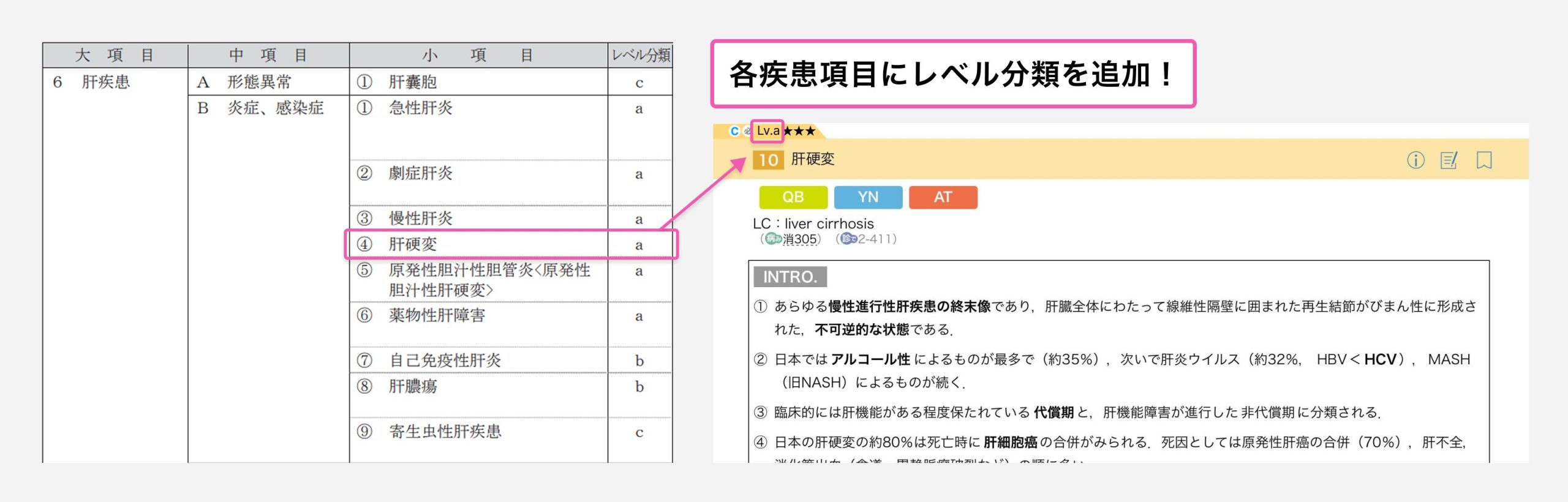 今回の改訂では,各疾患項目の上部に「レベル分類」を追加しました.こちらを見れば,各疾患の出題範囲が一目で分かり,学習効率UP間違いなしです!