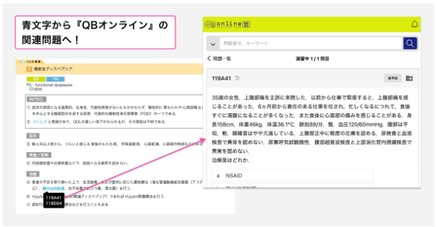 医師国家試験過去問題集『クエスチョン・バンク(QB)』と連携しているので,青字箇所をワンタップすれば関連する問題に飛んで問題演習をすることが可能です!
