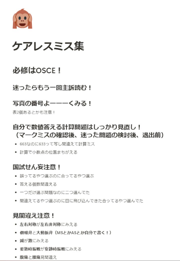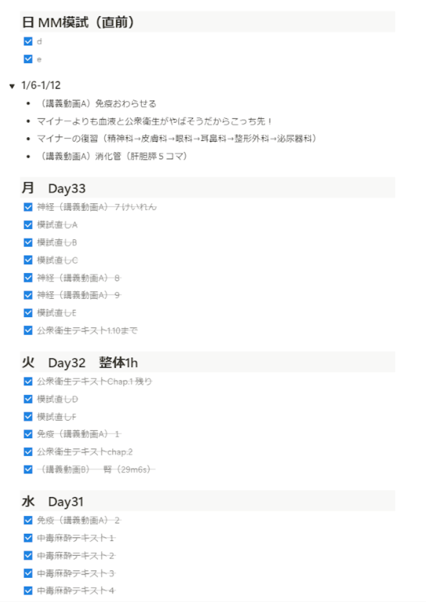 スケジュール管理以外にも医学生の日々の勉強の中で長期的に使うこともできます.私は講義動画視聴の進捗表やケアレスミス集を作っていました.