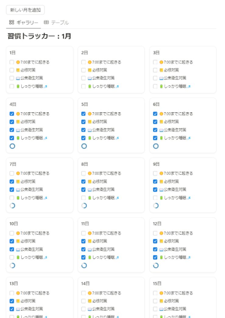また,Notionはテンプレートも豊富なので,自分で一から作るのはハードルが高い……でもNotionを使ってみたいという人にはテンプレートの使用がオススメです.私も習慣トラッカーというテンプレートを使っていました.