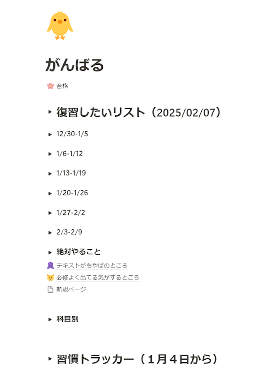 私がNotionでスケジュール管理を始めたのは,国試本番の6週間前です.Notionでは,1週間分のトグルをコピー&ペーストすることで簡単にトグルの中身ごと複製できるので,最初にこのページを作った段階でトグルを複製して6週間分のテンプレートを作成していました.