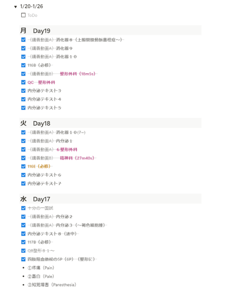 これは実際に使用していたページですが,スケジュールはトグルとToDoリストを主に活用して1週間ごとにまとめていました.各週のトグルの最初には,前の週を踏まえて,その週で主にやりたいことをメモ感覚で記載しています.曜日の隣には国試までの日数と,模試を解きたい日や勉強以外の予定を簡単に書いています.