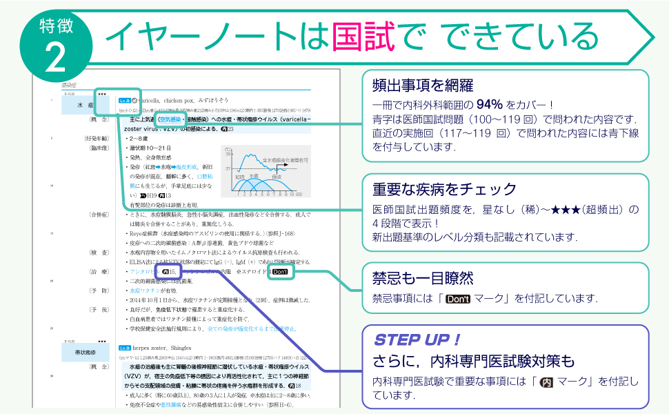 毎年の国家試験の徹底分析・誌面への反映のほかにも,教育・臨床現場の先生方監修のもと,周辺情報や「今の医学生や研修医に知っておいてもらいたいこと」を毎年厳選して改訂しています.これらの改訂こそが「『イヤーノート』は国家試験でできている」と言われる理由の一つです.数ある参考書や教科書の中でも,国家試験情報が毎年徹底的に反映されているのは『イヤーノート』だけといえます.