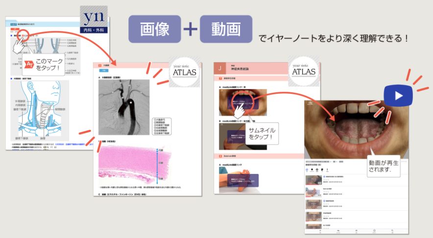 『イヤーノート内科・外科』とリンクしており,イヤーノート本文内にマークがついている箇所をタップすると,対応する画像を確認できます.