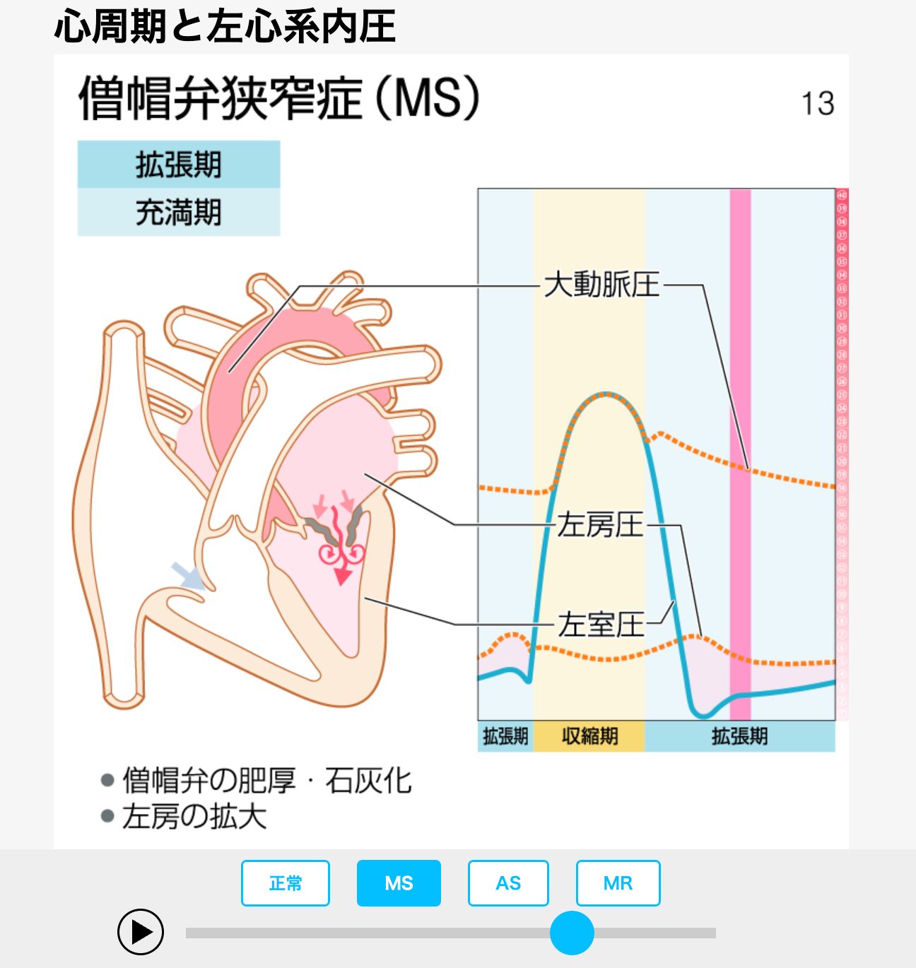 スライダーを自分で動かすと,「血液の流れ」「心臓の動き」「心内圧曲線」がすべて連動して動きます!