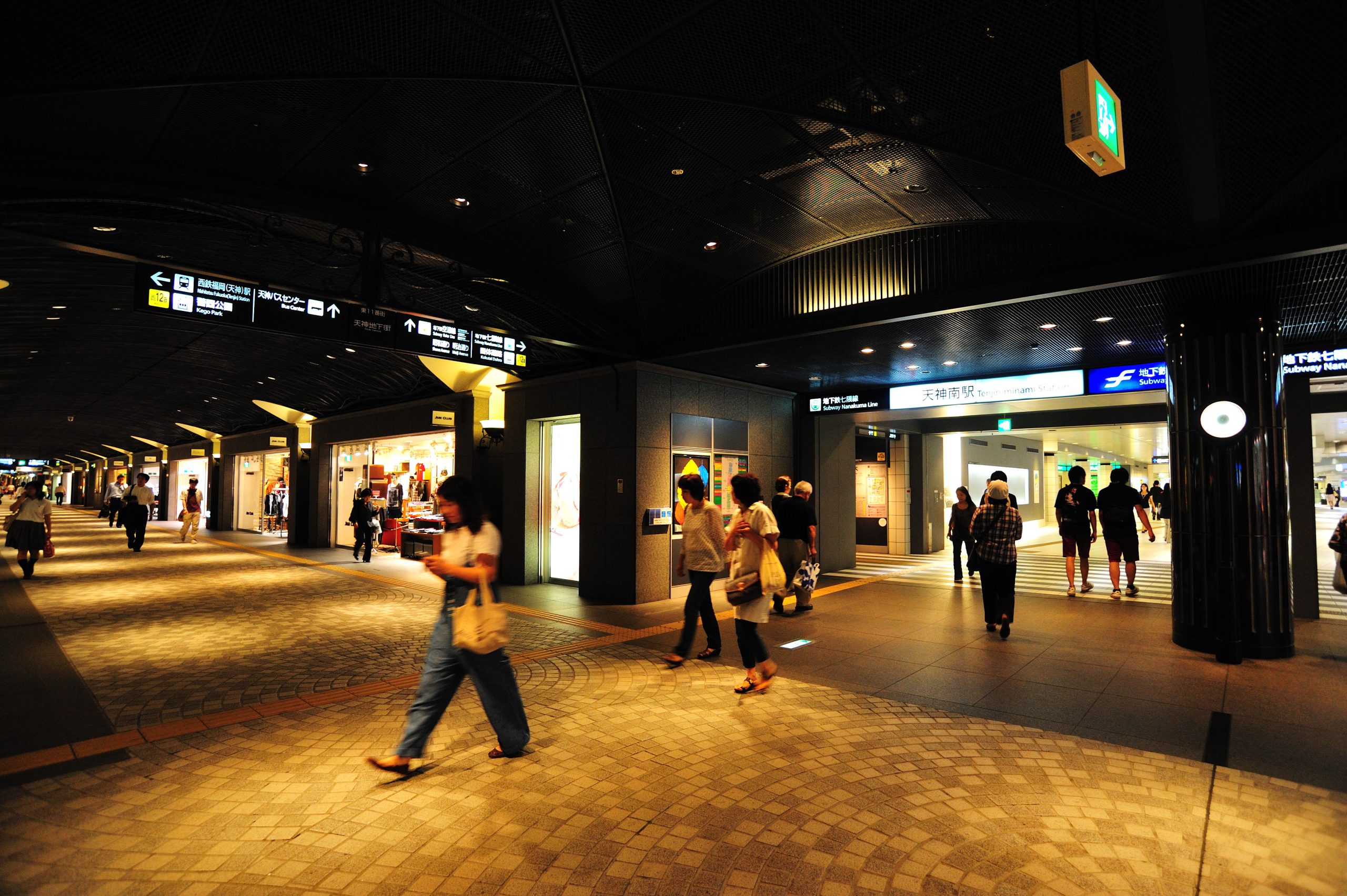 デパートやハイブランドの入ったビルがひしめく商業エリアですが,ここも中洲と並ぶ有名な屋台村があります。また590mも続く長い地下街にも飲食店が多数存在します.