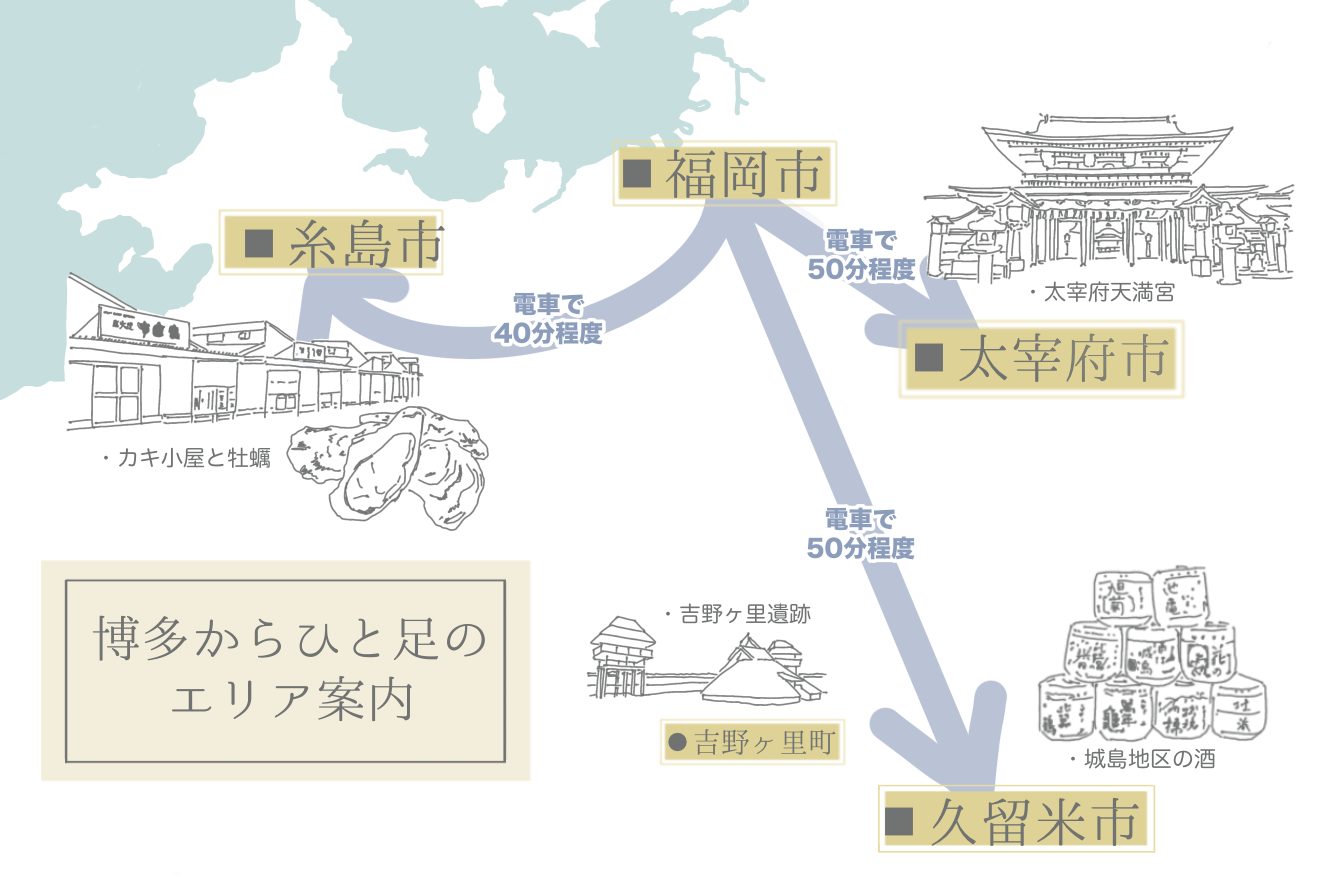 学会の前後に時間が取れた方は,ぜひ周辺の街に足を伸ばしてみてください.博多周辺には大宰府や久留米、糸島など半日程度あれば楽しめる場所がたくさんあります.