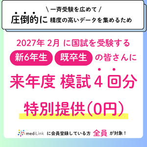 記事中でもご紹介した「メディックメディア医師国試模試 特別提供(0円)」キャンペーンは,すでに多数の受験生さんにお申し込みいただいております!