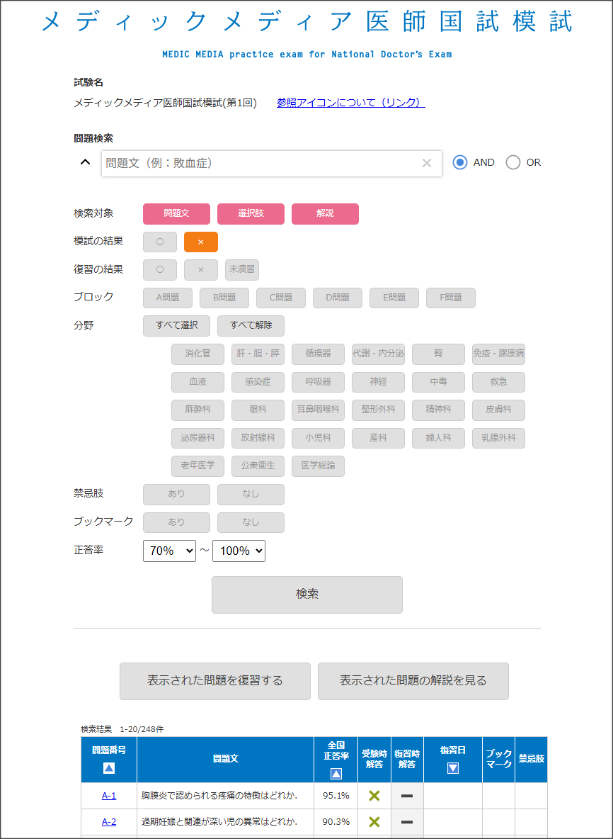 メディックメディア模試のサイトでも,フィルタ機能を使って,自分が間違えた問題(×)かつ正答率が高い問題(70%以上,80%以上など)を検索することで,該当する問題を素早く一覧にして復習することができます.さらに科目で絞るなど,自分に合った復習方法をぜひ活用してください.
