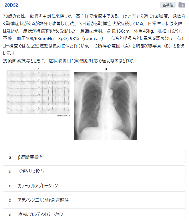 これらの選択肢は状況によっては心房細動に対して行う治療であり,症例を吟味したうえで適切な対応を選択する,という問題であり,難問といえるでしょう.発展的ではありますが適切な心房細動に対する対応を学ぶことができる,とても勉強になる問題でした.