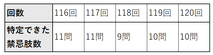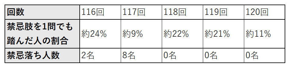 第117回では,禁忌落ちが8名と多かったのに対し,第118回以降は0名となっています.第117回で禁忌落ちが多かったことについては,禁忌肢選択3問以上で不合格とするという,厳しい採点基準による影響が大きいと考えられます.