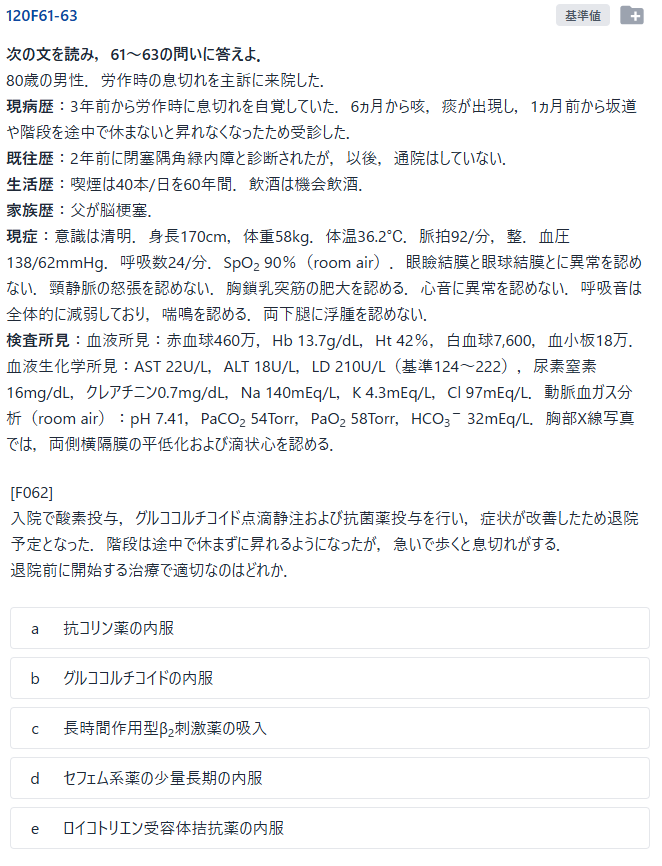 COPDの安定期治療(維持療法)として適切な薬剤を選ぶ問題で正答は「c. 長時間作用型β2刺激薬の吸入」でした.