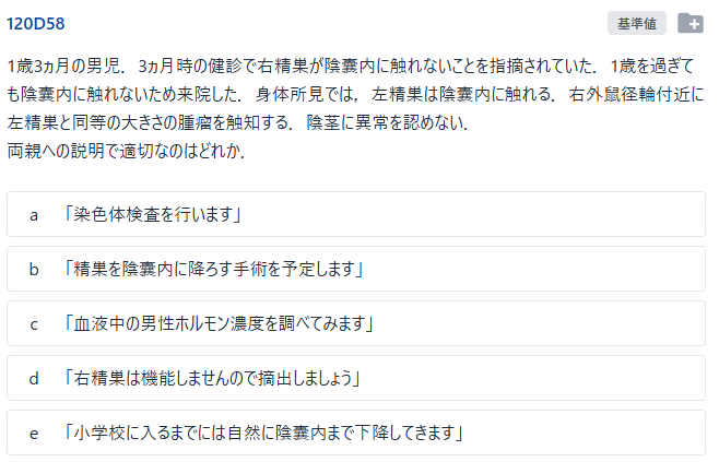 1歳3ヵ月の男児の右停留精巣に対しての対応の説明を問う問題で,正答は「b. 精巣を陰囊内に降ろす手術を予定します」でした.
