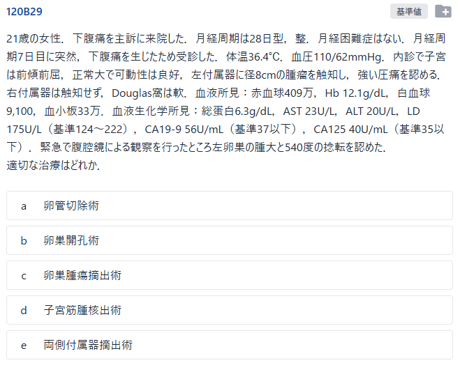 左卵巣腫瘍の茎捻転を疑い,「c. 卵巣腫瘍摘出術」が正答となる問題でした.